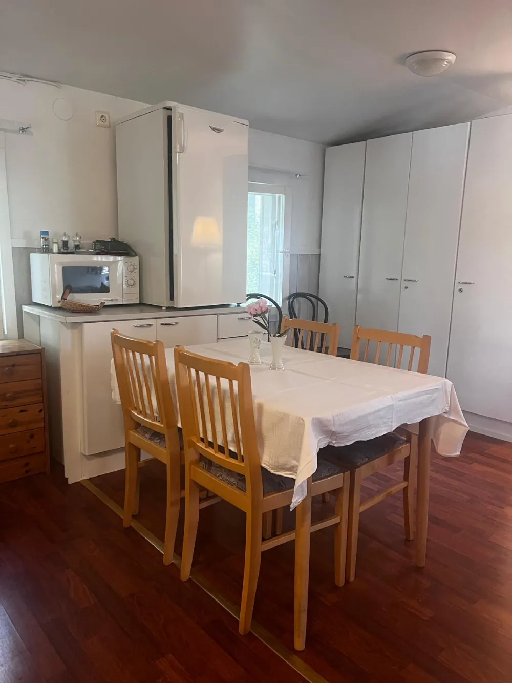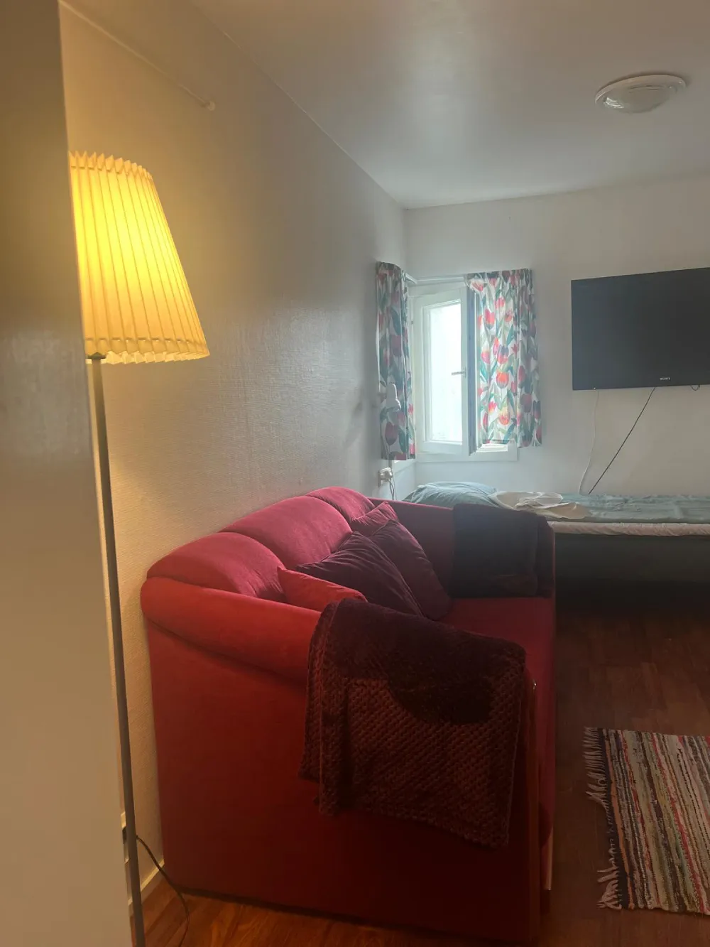 Huoneessa on oma wc/suihku, oleskelualue sekä keittiönurkkaus.